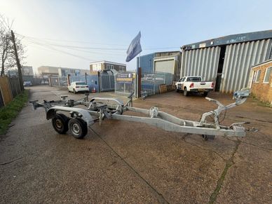 Braked boat trailer, fully galvanised with twin axles and mudguards. Features a winch post, six heavy duty adjustable supports, and a solid steel frame. Previously had a Jeanneau Merry Fisher 625 on. Brakes and Jockey wheel require attention.